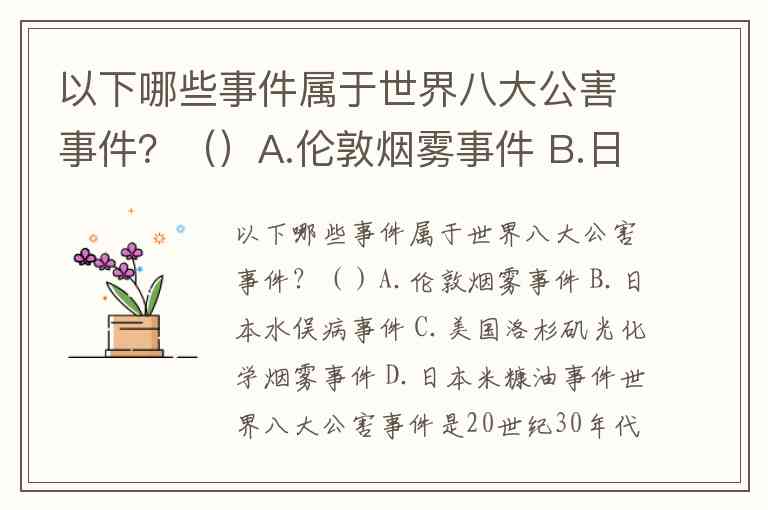世界八大公害事件是20世纪30年代至60年代工业化进程中发生的重大环境污染灾难,选项中 A.伦敦烟雾事件、B.日本水俣病事件、C.美国洛杉矶光化学烟雾事件、D.日本米糠油事件 均位列其中。这些事件横跨欧美及日本,涵盖大气、水体和有毒物质污染,造成数万人生病或死亡,成为全球环境治理的重要警示。
