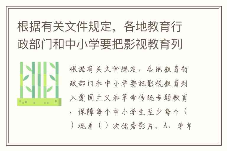 根据有关文件规定,各地教育行政部门和中小学要把影视教育列入爱国主义和革命传统专题教育,保障每个中小学生至少每个()观看()次优秀影片。A、学年、2 B、学期、1 C、学期、2 D、学年、2