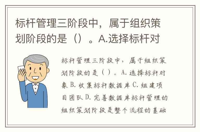 标杆管理三阶段中,属于组织策划阶段的是()。A.选择标杆对象 B.收集标杆数据库 C.组建项目团队 D.完善数据库