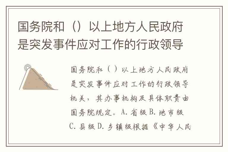 国务院和()以上地方人民政府是突发事件应对工作的行政领导机关,其办事机构及具体职责由国务院规定。A.省级 B.地市级 C.县级 D.乡镇级