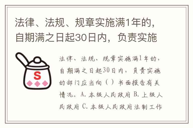 法律、法规、规章实施满1年的,自期满之日起30日内,负责实施的部门应当向()书面报告有关情况。A.本级人民政府 B.上级人民政府 C.本级人民政府法制工作机构 D.本级人民代表大会常务委员会