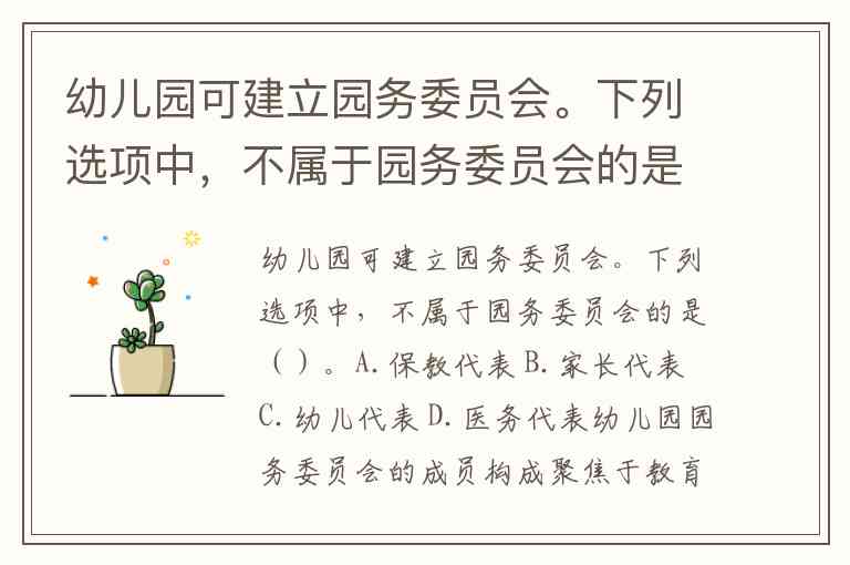 幼儿园可建立园务委员会。下列选项中,不属于园务委员会的是()。A.保教代表 B.家长代表 C.幼儿代表 D.医务代表
