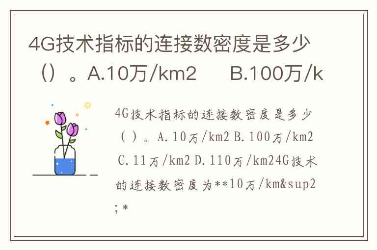 4G技术指标的连接数密度是多少()。A.10万/km2 B.100万/km2 C.11万/km2 D.110万/km2