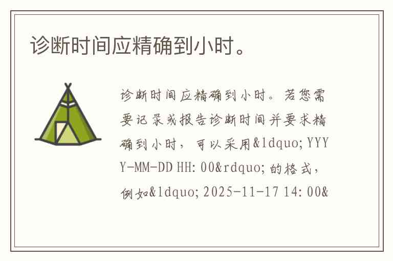 若您需要记录或报告诊断时间并要求精确到小时,可以采用“YYYY-MM-DD HH:00”的格式,例如“2025-11-17 14:00”表示2025年11月17日14时(下午2点)。这种格式既符合国际通用的ISO 8601标准,又能清晰体现精确到小时的时间要求,适用于医疗记录、事件报告等正式场景。在实际应用中,需确保时间与实际诊断开始或确认的整点时间一致,避免分钟数干扰小时级精度的表达。