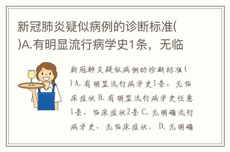 新冠肺炎疑似病例的诊断标准( )A.有明显流行病学史1条,无临床症状 B.有明显流行病学史任意1条,临床症状2条 C.无明确流行病学史,无临床症状。 D.无明确流行病学史,有临床症状3条