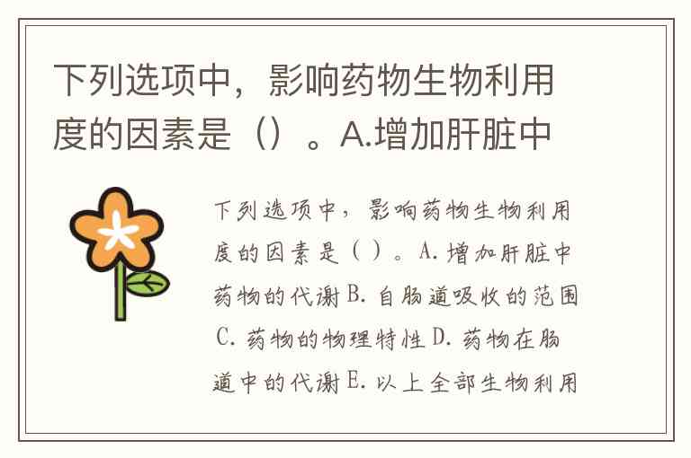 下列选项中,影响药物生物利用度的因素是()。A.增加肝脏中药物的代谢 B.自肠道吸收的范围 C.药物的物理特性 D.药物在肠道中的代谢 E.以上全部