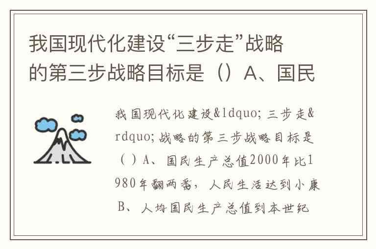 我国现代化建设“三步走”战略的第三步战略目标是()A、国民生产总值2000年比1980年翻两番,人民生活达到小康 B、人均国民生产总值到本世纪中叶达到中等发达国家水平,人民生活比较富裕,基本实现现代化。 C、人均国民收入2000年比1980年翻两番,人民生活达到小康。 D、国内生产总值2020年比2000年翻两番,实现全面小康社会目标。