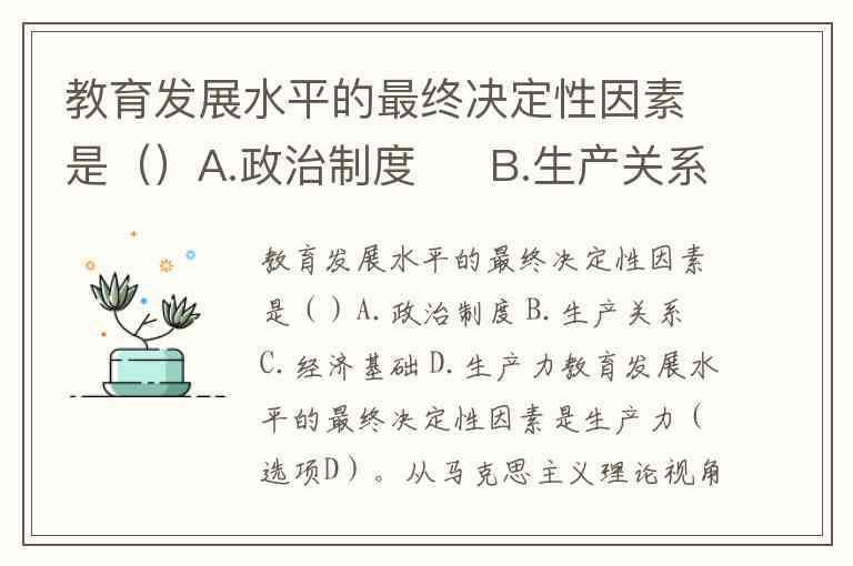 教育发展水平的最终决定性因素是()A.政治制度 B.生产关系 C.经济基础 D.生产力