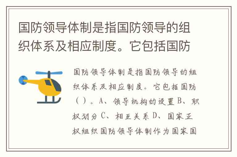 国防领导体制是指国防领导的组织体系及相应制度。它包括国防()。A、领导机构的设置 B、职权划分 C、相互关系 D、国家正权组织