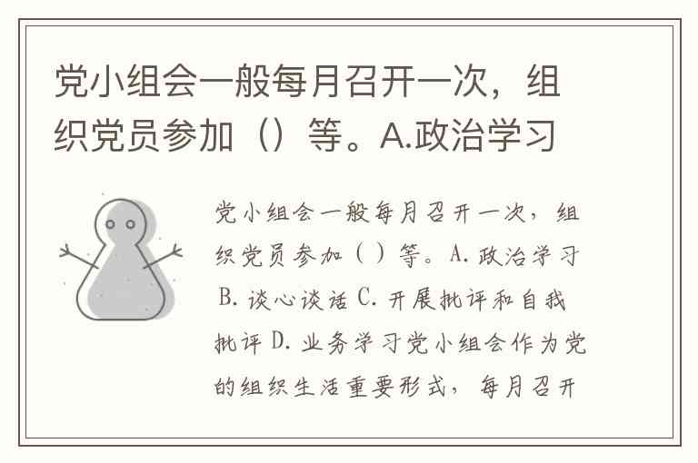 党小组会一般每月召开一次,组织党员参加()等。A.政治学习 B.谈心谈话 C.开展批评和自我批评 D.业务学习