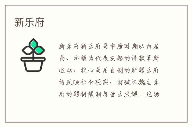 新乐府是中唐时期以白居易、元稹为代表发起的诗歌革新运动,核心是用自创的新题乐府诗反映社会现实,打破汉魏古乐府的题材限制与音乐束缚。这场运动始于杜甫"因事立题"的创作实践,经元结、顾况继承,最终由白居易提出"文章合为时而著,歌诗合为事而作"的理论纲领,形成声势浩大的文学革新。