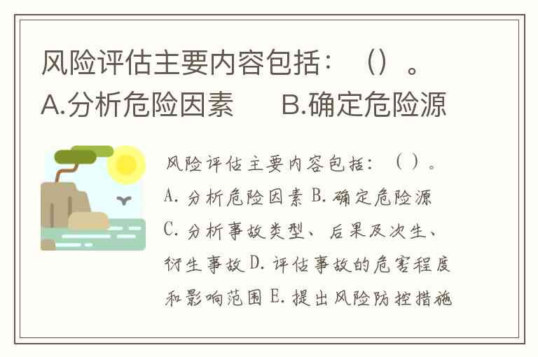 风险评估主要内容包括:()。A.分析危险因素 B.确定危险源 C.分析事故类型、后果及次生、衍生事故 D.评估事故的危害程度和影响范围 E.提出风险防控措施