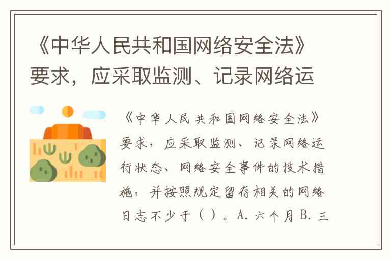 《中华人民共和国网络安全法》要求,应采取监测、记录网络运行状态、网络安全事件的技术措施,并按照规定留存相关的网络日志不少于()。A.六个月 B.三个月 C.一个月 D.九个月