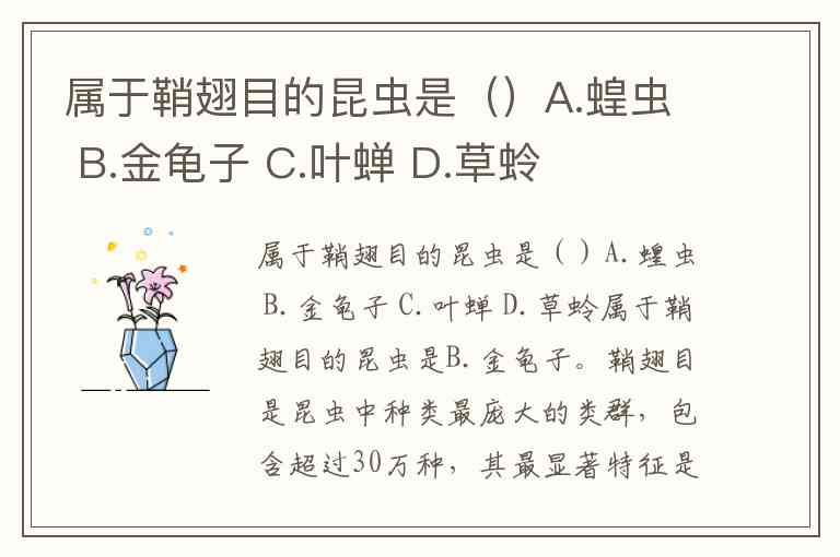 属于鞘翅目的昆虫是()A.蝗虫 B.金龟子 C.叶蝉 D.草蛉