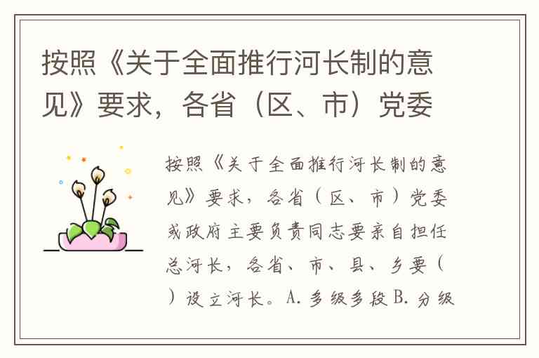按照《关于全面推行河长制的意见》要求,各省(区、市)党委或政府主要负责同志要亲自担任总河长,各省、市、县、乡要()设立河长。A.多级多段 B.分级分段 C.功能区划 D.行政区划