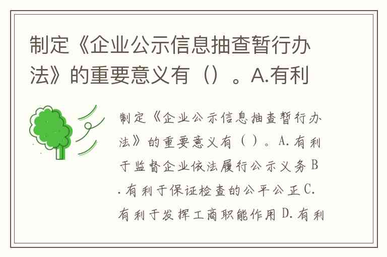 制定《企业公示信息抽查暂行办法》的重要意义有()。A.有利于监督企业依法履行公示义务 B.有利于保证检查的公平公正 C.有利于发挥工商职能作用 D.有利于促进社会诚信