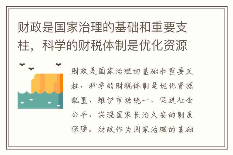 财政是国家治理的基础和重要支柱,科学的财税体制是优化资源配置、维护市场统一、促进社会公平、实现国家长治久安的制度保障。