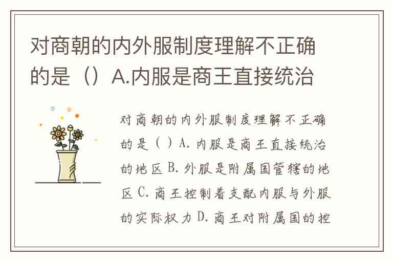 对商朝内外服制度理解不正确的是 D。商朝的内服是商王直接统治的王畿地区,外服则是附属国管辖的区域,商王通过两种管理制度处理本族与外族事务,控制着联盟的实际权力。但这种支配关系以商王的军事力量为基础,附属国并非完全受制于商王——它们保持原有社会结构,拥有军队、赋税自主权,仅需履行纳贡、随商王征战等义务。文档明确指出,商王对附属国的控制力有限,二者常处于战争状态,如“商王经常与附属国处于战争状态”“有的附属国还经常与商处于战争状态”。这种松散联盟的特性,与选项D中“商王对附属国的控制力很大,附属国基本没有自主权”的描述完全相悖。