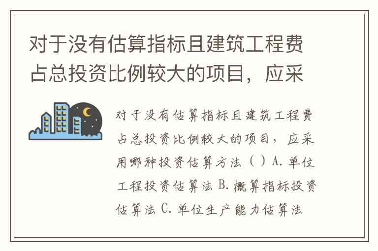 对于没有估算指标且建筑工程费占总投资比例较大的项目,应采用哪种投资估算方法()A.单位工程投资估算法 B.概算指标投资估算法 C.单位生产能力估算法 D.系数估算法