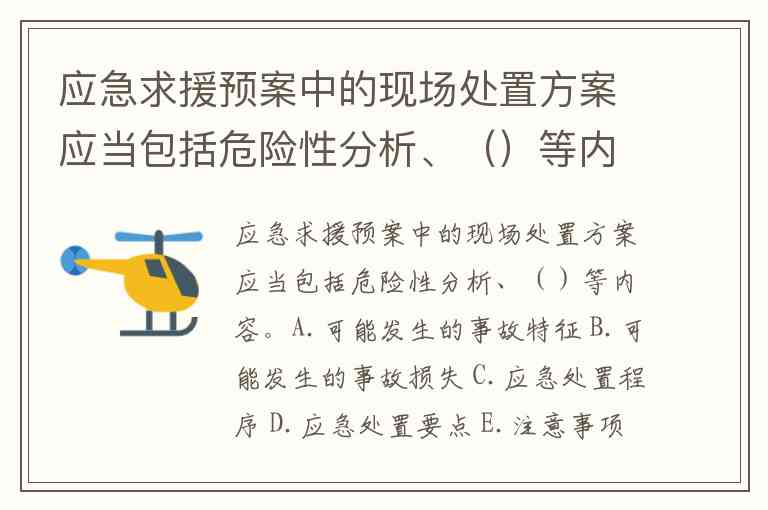 应急求援预案中的现场处置方案应当包括危险性分析、()等内容。A.可能发生的事故特征 B.可能发生的事故损失 C.应急处置程序 D.应急处置要点 E.注意事项