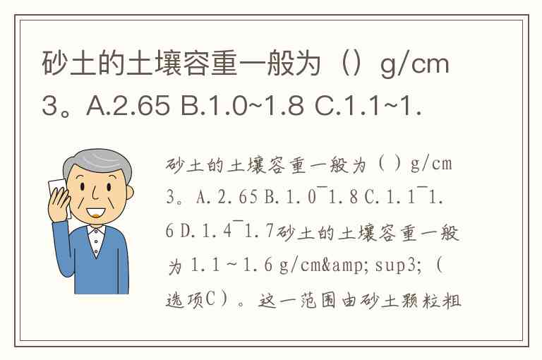 砂土的土壤容重一般为()g/cm3。A.2.65 B.1.0~1.8 C.1.1~1.6 D.1.4~1.7
