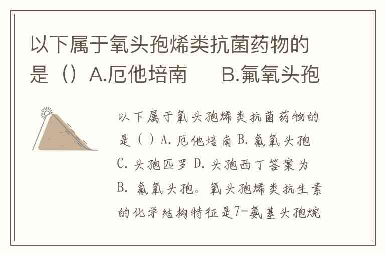 以下属于氧头孢烯类抗菌药物的是()A.厄他培南 B.氟氧头孢 C.头孢匹罗 D.头孢西丁