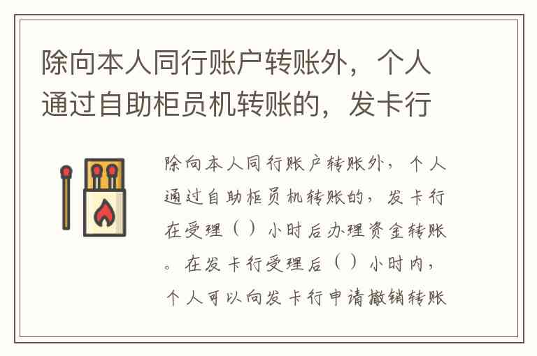 个人通过自助柜员机(含其他具有存取款功能的自助设备)向非本人同行账户转账时,发卡行在受理24小时后办理资金转账,且在受理后24小时内可申请撤销转账。这一规则由中国人民银行在《关于加强支付结算管理防范电信网络新型违法犯罪有关事项的通知》中明确规定,旨在防范电信网络诈骗,为用户争取资金挽回时间。