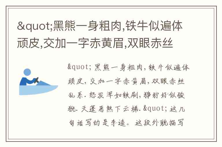 "黑熊一身粗肉,铁牛似遍体顽皮,交加一字赤黄眉,双眼赤丝乱系.怒发浑如铁刷,狰狞好似狻猊.天蓬恶煞下云梯."这几句话写的是李逵。