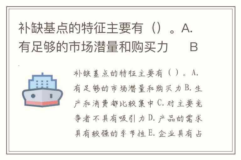 补缺基点的特征主要有()。A.有足够的市场潜量和购买力 B.生产和消费都比较集中 C.对主要竞争者不具有吸引力 D.产品的需求具有较强的季节性 E.企业具有占据该补缺基点所必需的资源和能力