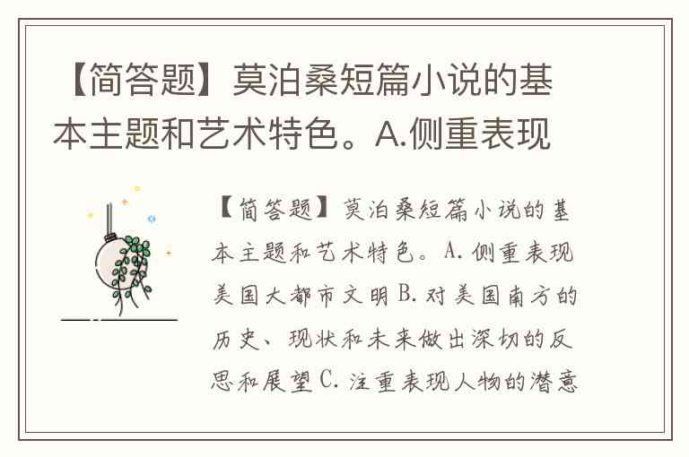 【简答题】莫泊桑短篇小说的基本主题和艺术特色。A.侧重表现美国大都市文明 B.对美国南方的历史、现状和未来做出深切的反思和展望 C.注重表现人物的潜意识和变态心理 D.系列性 E.发展意识流手法