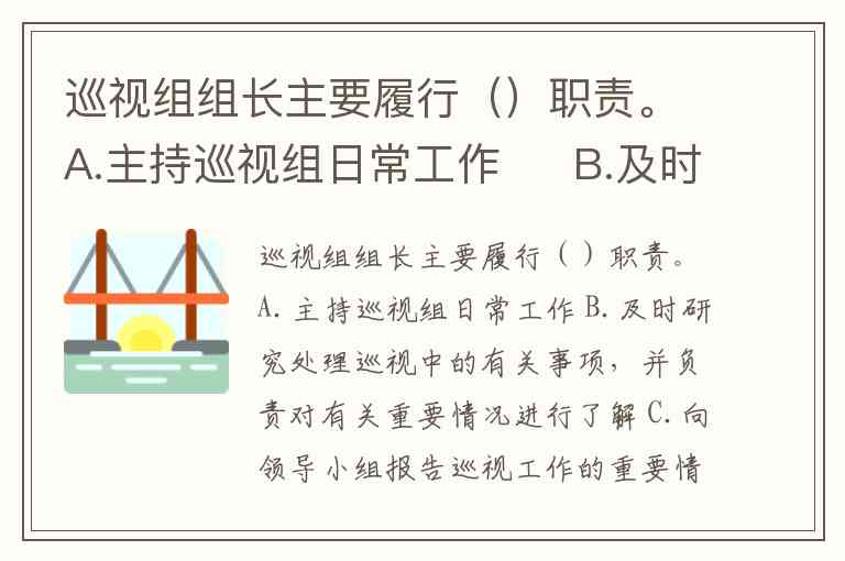 巡视组组长主要履行ABCDE职责。根据《中央巡视组工作规则》,巡视组实行组长负责制,组长需全面主持工作,涵盖日常管理、重大事项处置、人员管理等关键领域。