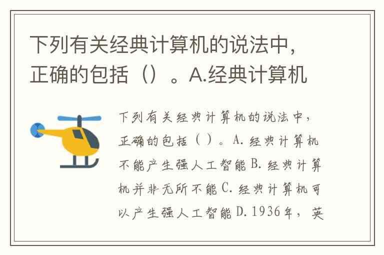 下列有关经典计算机的说法中,正确的包括()。A.经典计算机不能产生强人工智能 B.经典计算机并非无所不能 C.经典计算机可以产生强人工智能 D.1936年,英国人图灵提出计算机概念的模型,证明“不可计算数”的存在 E.经典计算机能够做的实际上是无边界的