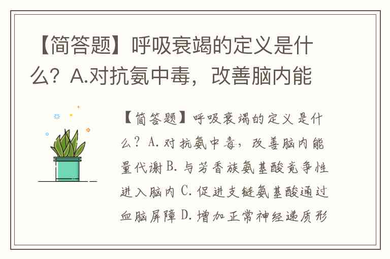 【简答题】呼吸衰竭的定义是什么?A.对抗氨中毒,改善脑内能量代谢 B.与芳香族氨基酸竟争性进入脑内 C.促进支链氨基酸通过血脑屏障 D.增加正常神经递质形成 E.抑制假性神经递质形成