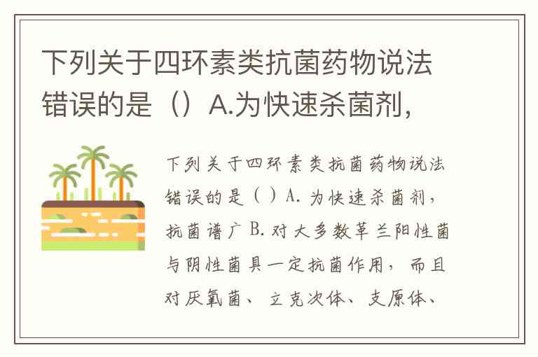 下列关于四环素类抗菌药物说法错误的是()A.为快速杀菌剂,抗菌谱广 B.对大多数革兰阳性菌与阴性菌具一定抗菌作用,而且对厌氧菌、立克次体、支原体、衣原体、螺旋体和某些原虫也有良好作用 C.能广泛分布于各组织与体液中,并储存在肝、脾、骨、牙齿中 D.在胆汁、前列腺中浓度较高 E.能透过胎盘,可透入脑脊液