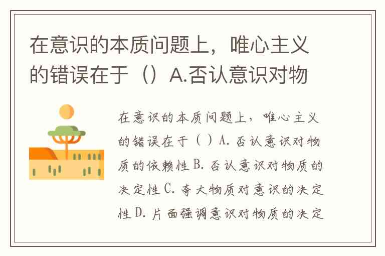 在意识的本质问题上,唯心主义的错误在于()A.否认意识对物质的依赖性 B.否认意识对物质的决定性 C.夸大物质对意识的决定性 D.片面强调意识对物质的决定作用