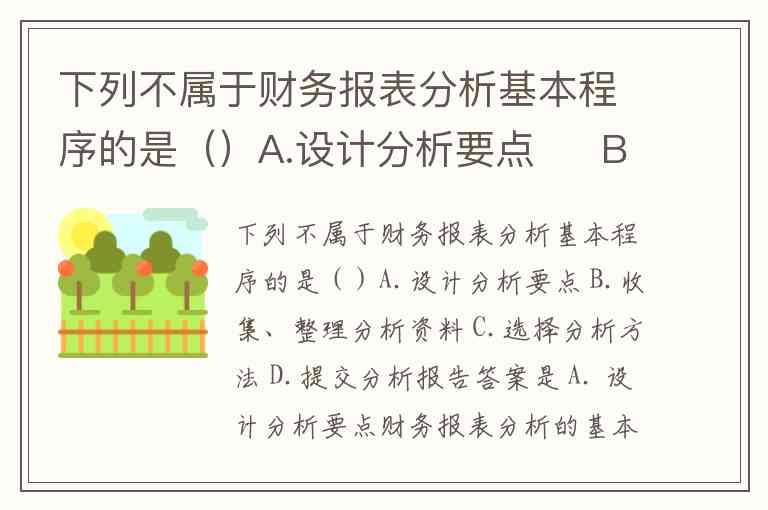 下列不属于财务报表分析基本程序的是()A.设计分析要点 B.收集、整理分析资料 C.选择分析方法 D.提交分析报告