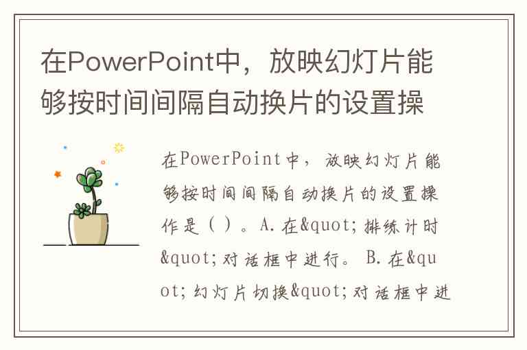 在PowerPoint中,放映幻灯片能够按时间间隔自动换片的设置操作是()。A.在"排练计时"对话框中进行。 B.在"幻灯片切换"对话框中进行。 C.在"自定义动画"对话框中进行。 D.在"编辑"对话框中进行。