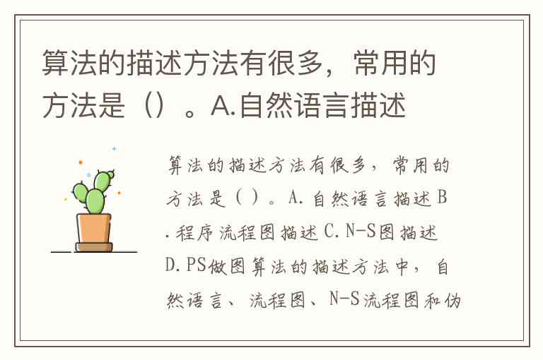 算法的描述方法有很多,常用的方法是()。A.自然语言描述 B.程序流程图描述 C.N-S图描述 D.PS做图