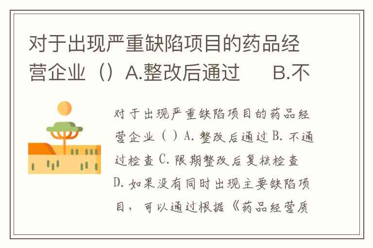 对于出现严重缺陷项目的药品经营企业()A.整改后通过 B.不通过检查 C.限期整改后复核检查 D.如果没有同时出现主要缺陷项目,可以通过