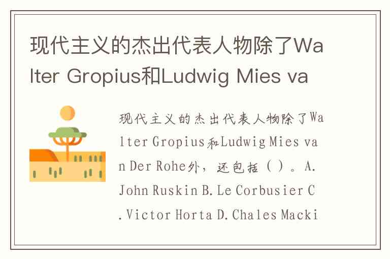 现代主义的杰出代表人物除了Walter Gropius和Ludwig Mies van Der Rohe外,还包括()。A.John Ruskin B.Le Corbusier C.Victor Horta D.Chales Mackintosh