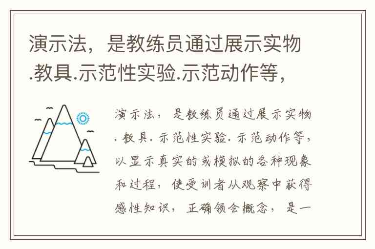 演示法,是教练员通过展示实物.教具.示范性实验.示范动作等,以显示真实的或模拟的各种现象和过程,使受训者从观察中获得感性知识,正确领会概念,是一种运用较为广泛的教学方法。