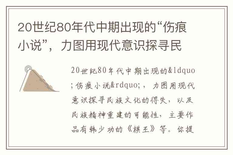 20世纪80年代中期出现的“伤痕小说”,力图用现代意识探寻民族文化的得失,以及民族精神重建的可能性,主要作品有韩少功的《棋王》等。