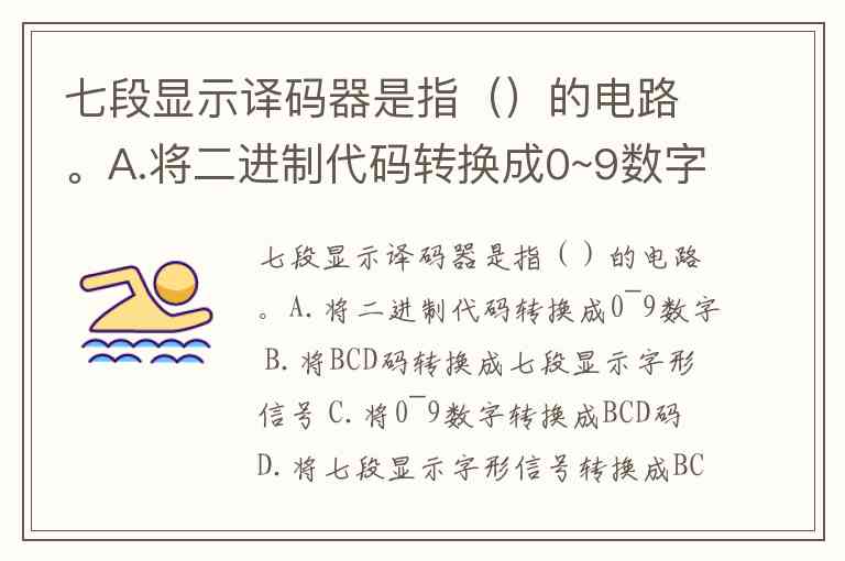 七段显示译码器是指()的电路。A.将二进制代码转换成0~9数字 B.将BCD码转换成七段显示字形信号 C.将0~9数字转换成BCD码 D.将七段显示字形信号转换成BCD码