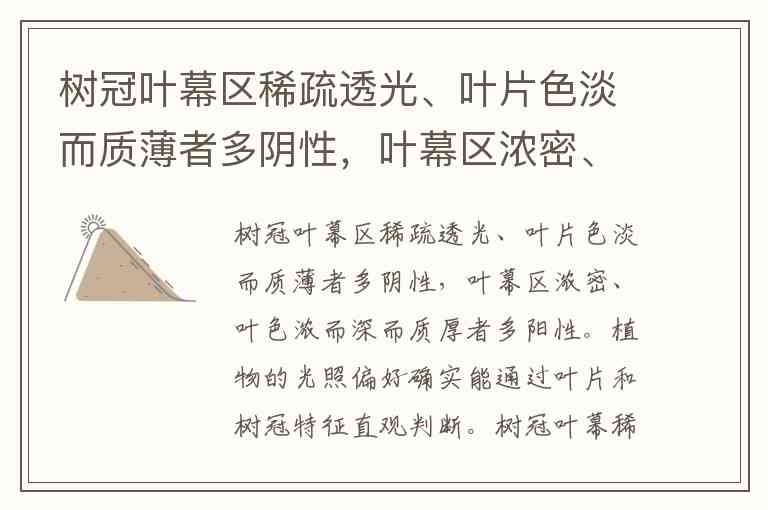 植物的光照偏好确实能通过叶片和树冠特征直观判断。树冠叶幕稀疏透光、叶片色淡质薄通常为阴性植物,而叶幕浓密、叶色深绿质厚则多为阳性植物,这背后是植物长期适应不同光照环境的进化结果。
