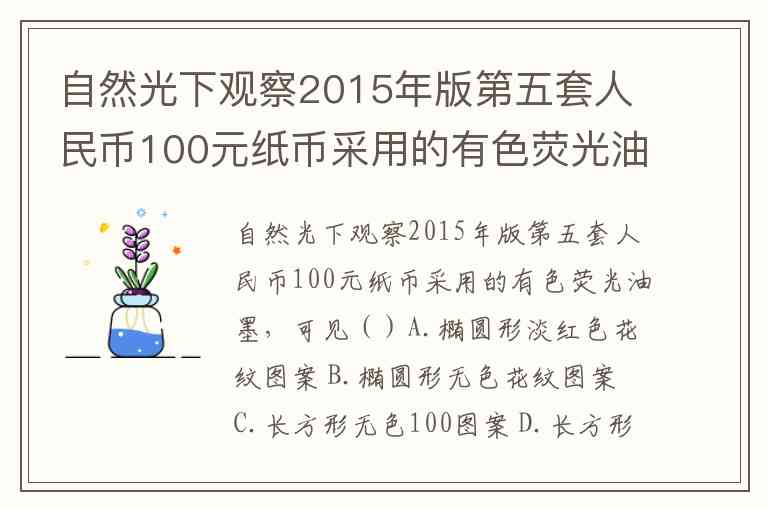 自然光下观察2015年版第五套人民币100元纸币采用的有色荧光油墨,可见()A.椭圆形淡红色花纹图案 B.椭圆形无色花纹图案 C.长方形无色100图案 D.长方形黄色100图案