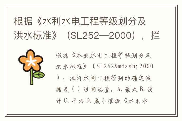 根据《水利水电工程等级划分及洪水标准》(SL252—2000),拦河水闸工程等别的确定依据是()过闸流量。A.最大 B.设计 C.平均 D.最小