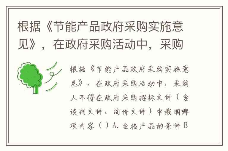 根据《节能产品政府采购实施意见》,在政府采购活动中,采购人不得在政府采购招标文件(含谈判文件、询价文件)中载明哪项内容()A.合格产品的条件 B.产品的节能要求 C.节能产品优先采购的评审标准 D.节能产品的品牌