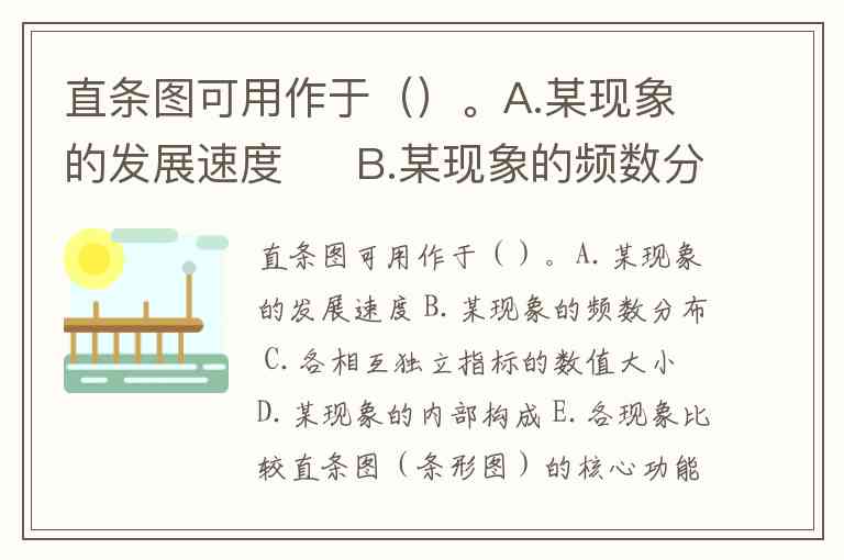 直条图(条形图)的核心功能是通过等宽直条的长度或高度直观展示数值差异,特别适用于相互独立指标的比较和分类数据的频数展示。根据文档资料,正确选项为 B.某现象的频数分布、C.各相互独立指标的数值大小、E.各现象比较。