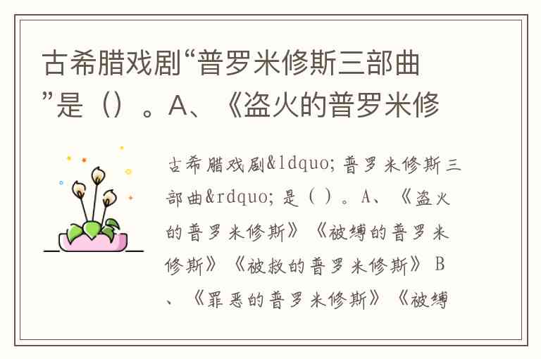 古希腊戏剧“普罗米修斯三部曲”是埃斯库罗斯创作的悲剧系列,现存仅《被缚的普罗米修斯》完整传世,其余两部《带火的普罗米修斯》(或译《盗火的普罗米修斯》)和《被解放的普罗米修斯》(或译《解放的普罗米修斯》)仅有残片存世。根据史料记载与学术共识,三部曲的正确排序应为:第一部讲述普罗米修斯盗取天火赐予人类的《带火的普罗米修斯》(部分文献译为《盗火的普罗米修斯》),第二部展现其被宙斯惩罚缚于高加索山的《被缚的普罗米修斯》,第三部描绘宙斯最终和解并释放他的《被解放的普罗米修斯》。
