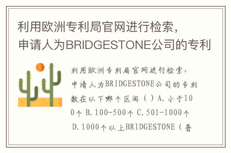 利用欧洲专利局官网进行检索,申请人为BRIDGESTONE公司的专利数在以下哪个区间()A.小于100个 B.100-500个 C.501-1000个 D.1000个以上